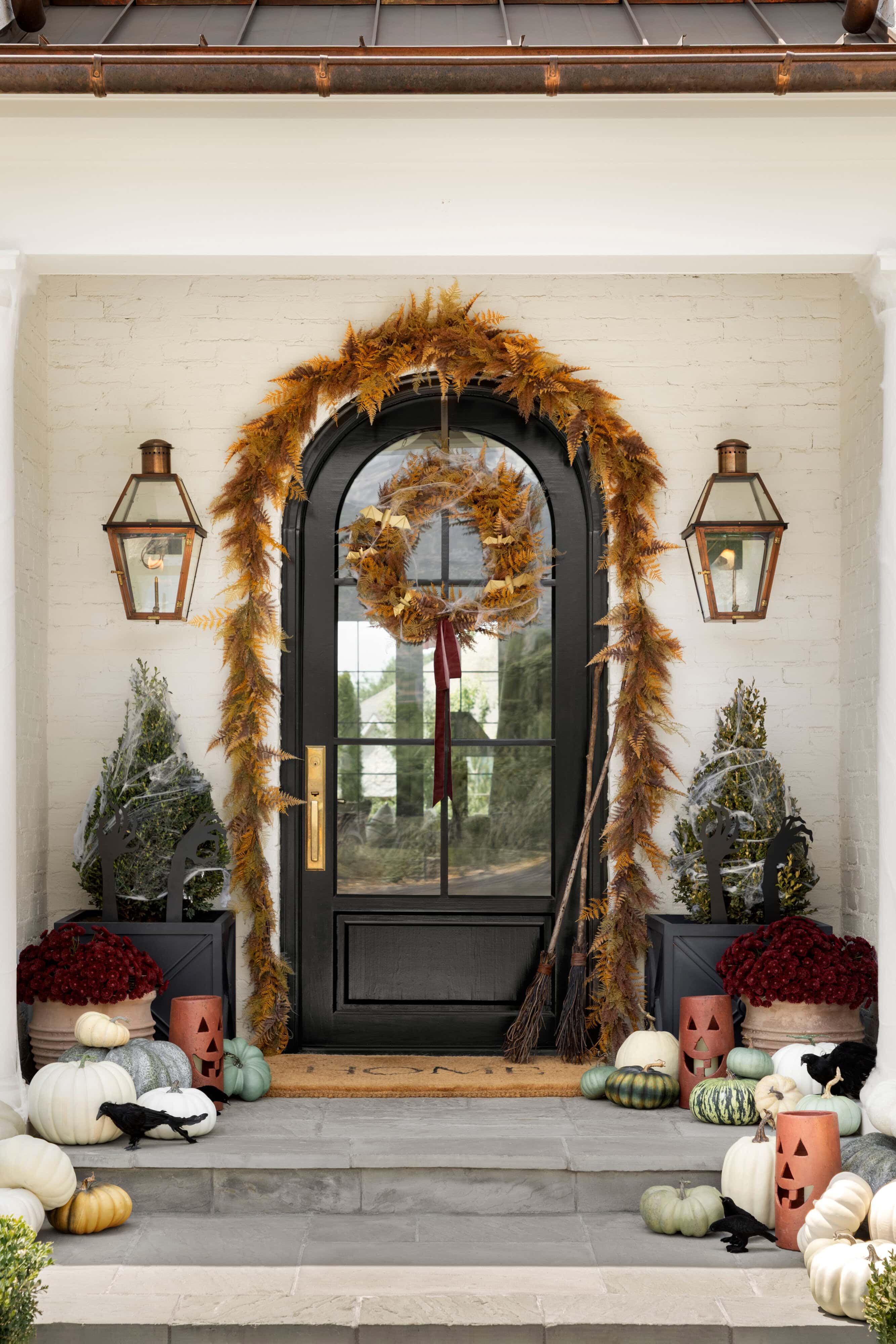 It’s also about trying something different. “This year we went with a garland over the door and I’m loving this fresh perspective,” says Shea. “Yes, we’ve got pumpkins and mums, but we did it in a new way.” An assortment of potted greens completes the look. It’s an elevated approach to fall front porch décor that we’re loving.
