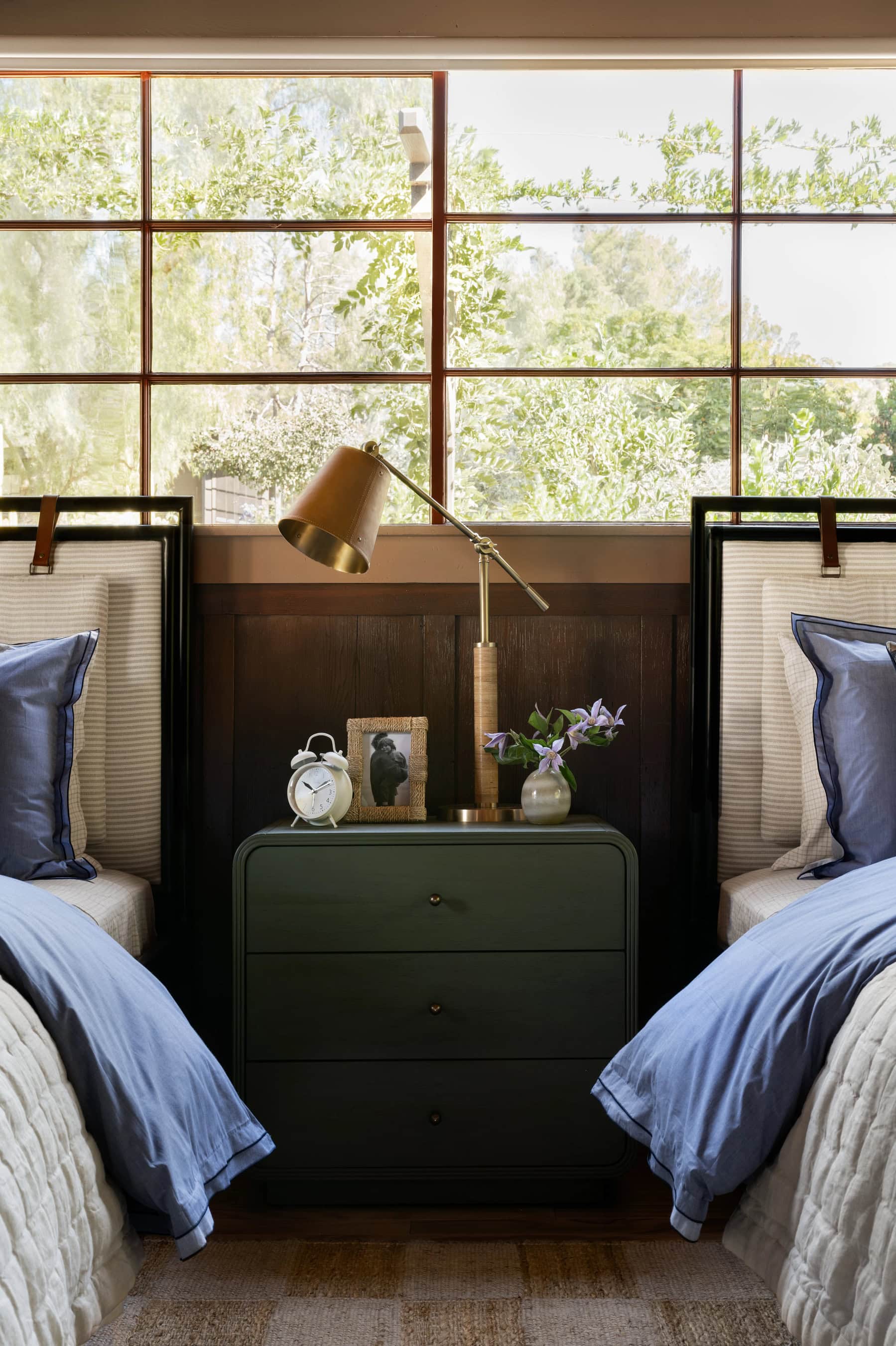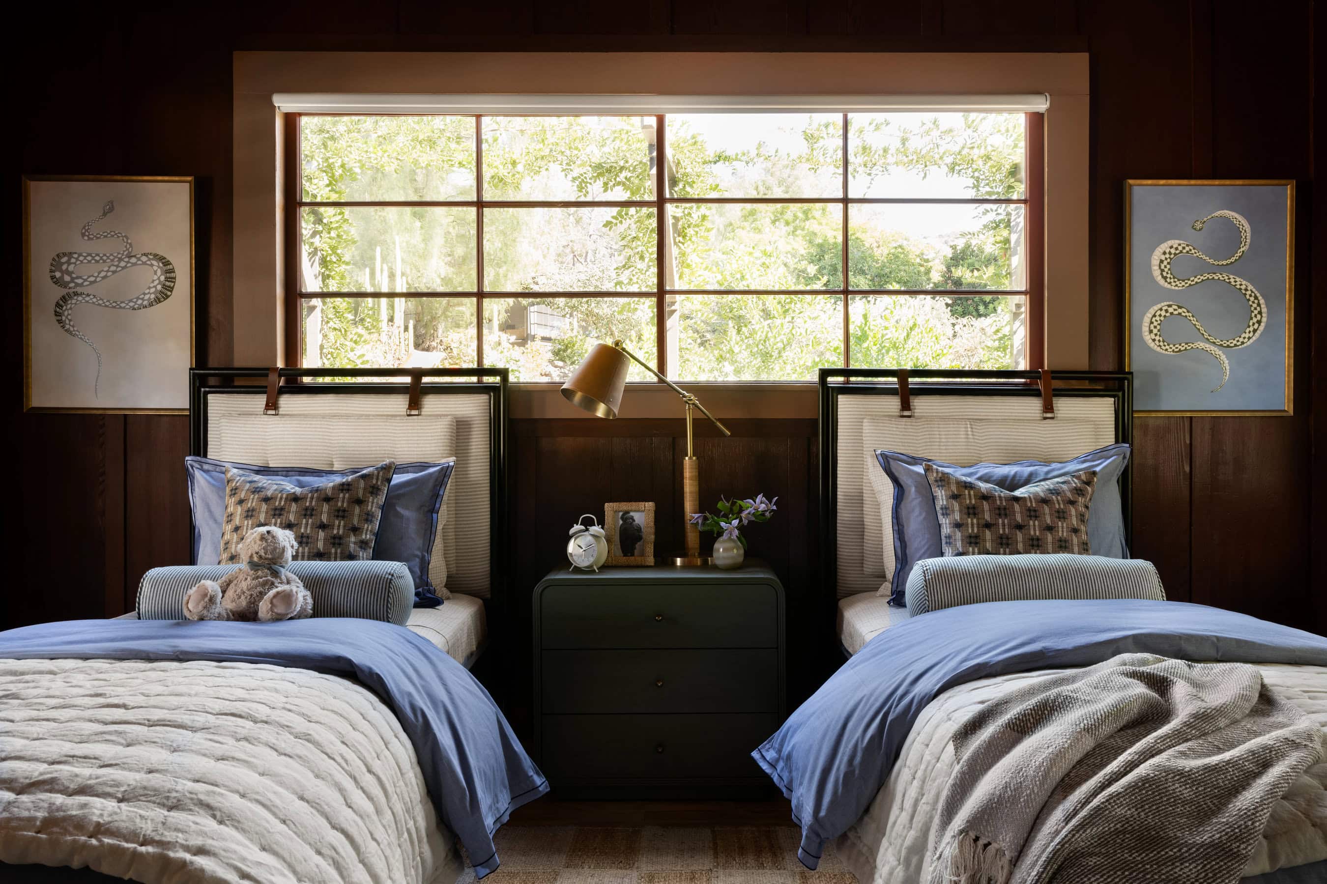 From our McGee & Co. Spring 2024 collection shoot, this earthy yet moody kids’ space showcases a blend of texture and personality. Set against the dark wood paneling, the room feels both grounded and inviting. The layered bedding in rich shades of blue adds warmth, while the bold snake artwork introduces a playful yet striking focal point.