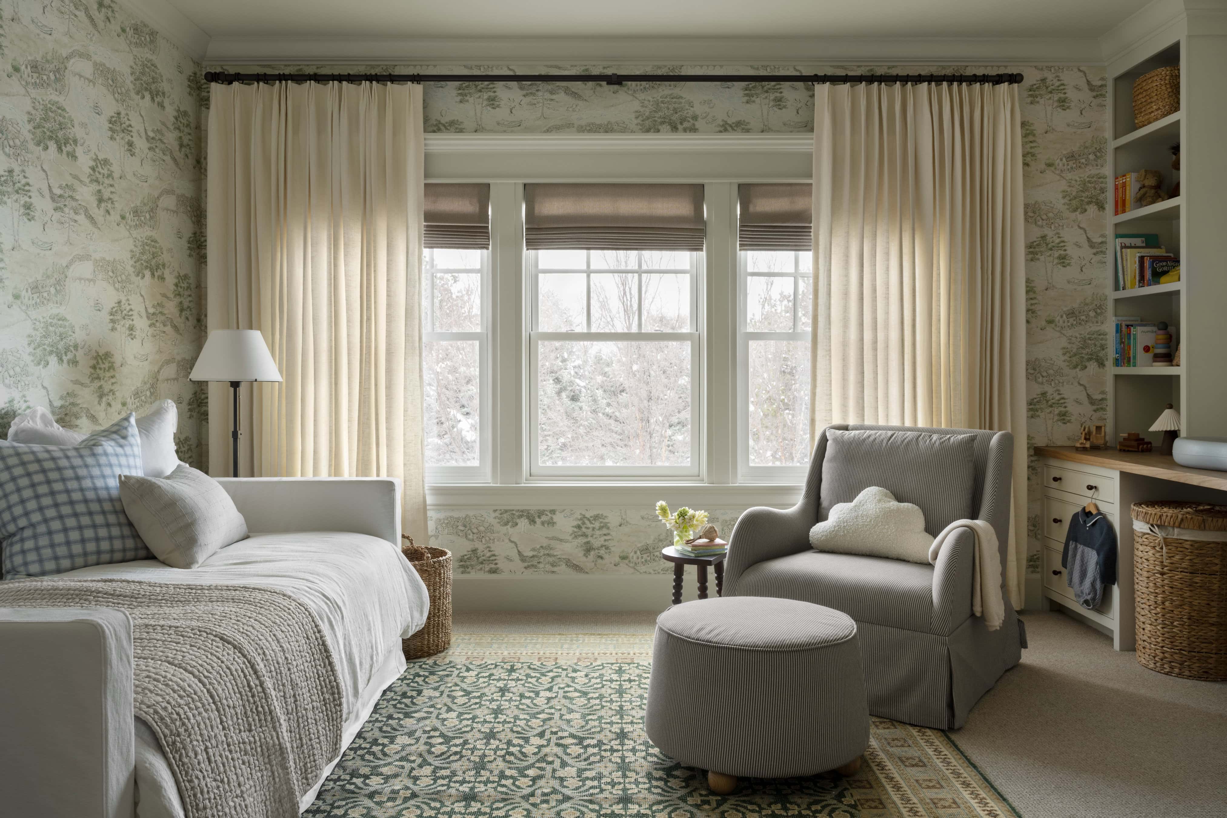 This toddler bedroom strikes the perfect balance between whimsy and sophistication, creating a space that grows alongside its young occupant. The wallpaper sets the tone with its playful yet timeless pattern, anchoring the room’s calming palette of creams, greens, and blues. A daybed is an good choice for a toddler’s room, providing a seamless transition from a crib to a big-kid bed.