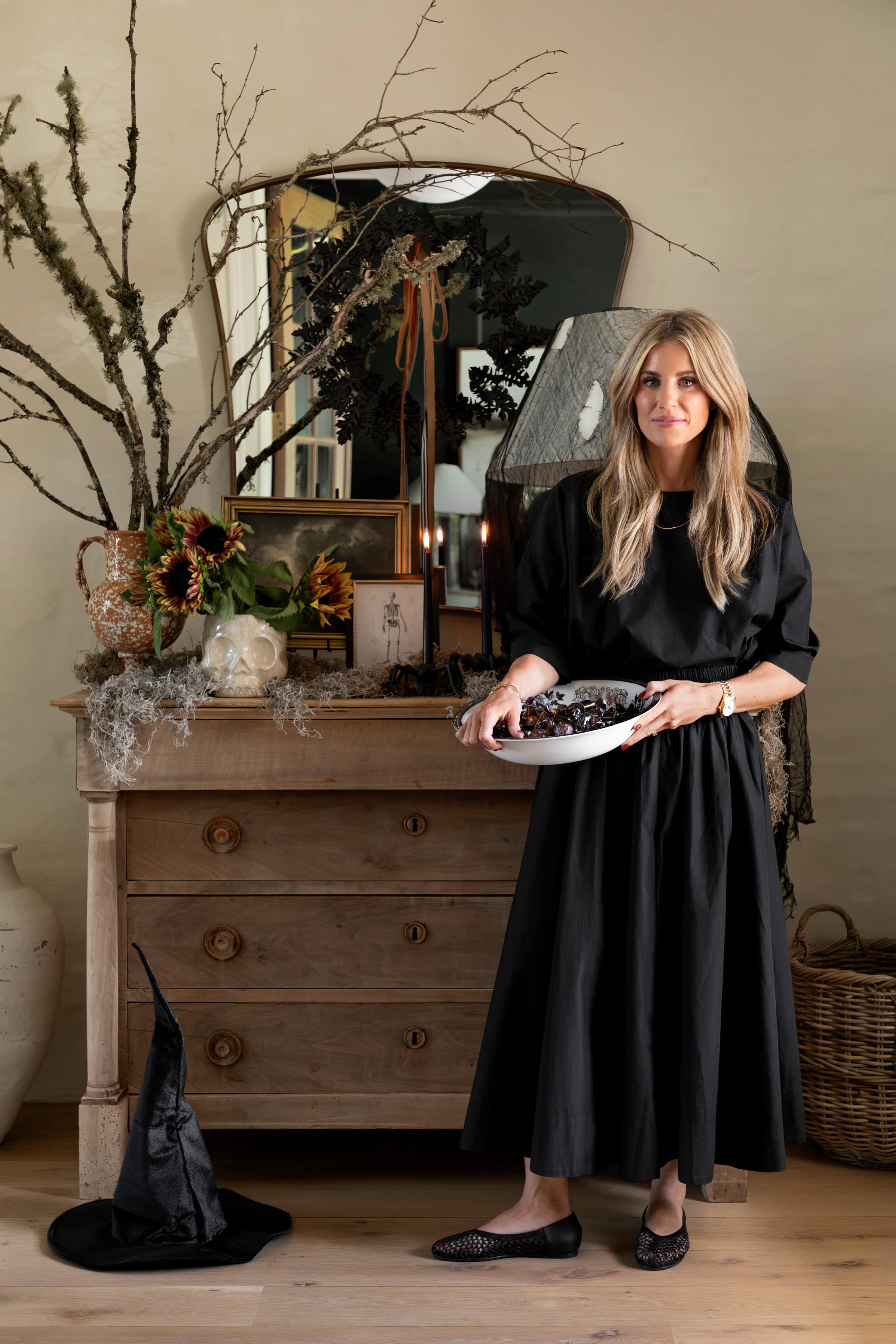 Designed to inspire, the Halloween styling blends cozy autumn décor with subtle nods to the season’s darker side. Spanish moss drapes softly across the surface, a textured contrast to the clean lines of the mirror and the sculptural arrangement of branches. The look is perfectly imperfect—an editorial take on festive fall styling that feels collected over time. It’s a masterclass in mixing organic materials, layered neutrals, and statement pieces to create a home that feels ready for crisp October nights and festive gatherings alike.