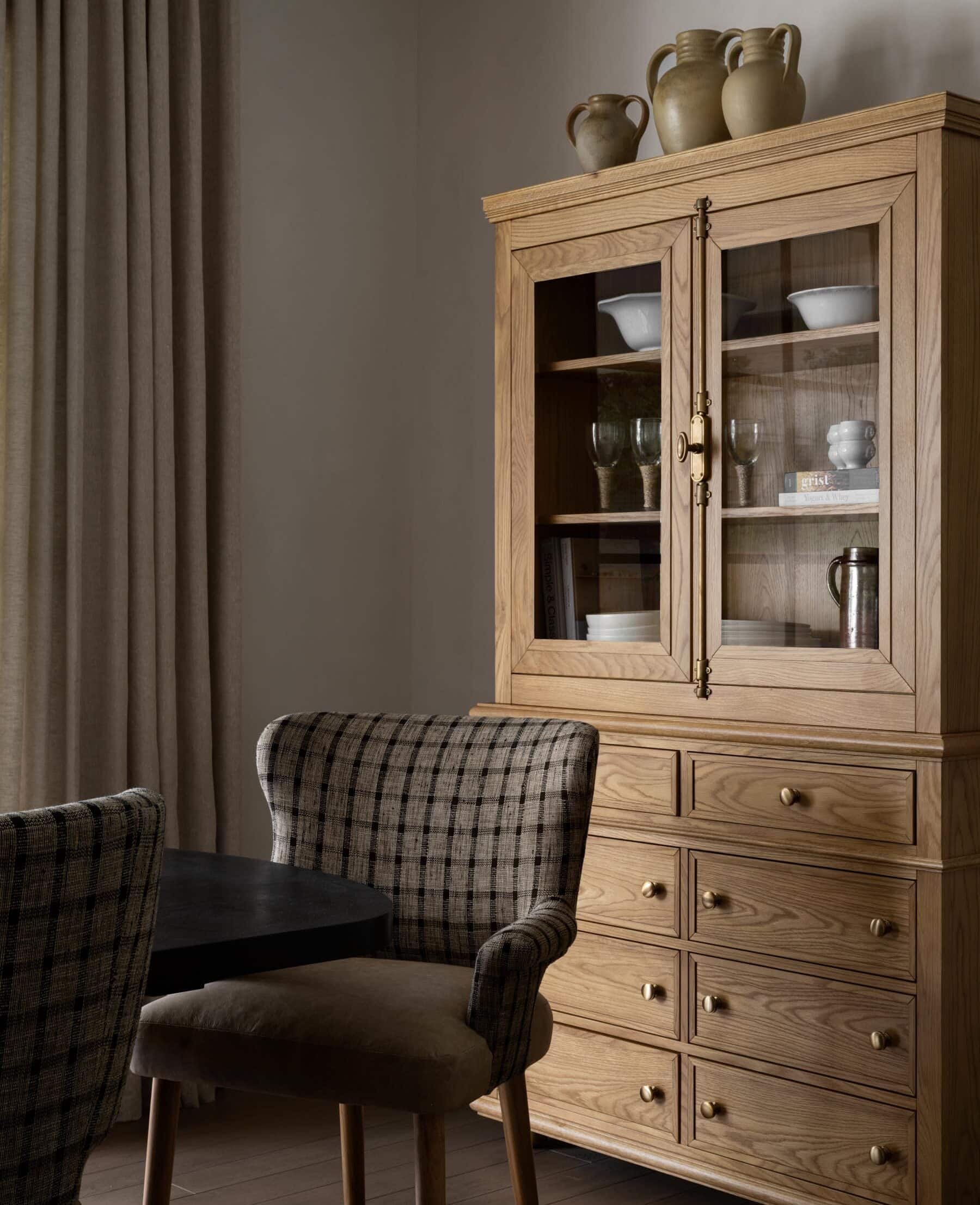With a traditional design, our Heath Oak Cabinet is stately and elegant. This oak cabinet was crafted with a keen attention to detail, featuring keyholes and round pulls on the drawers and beautiful glass doors enclosing three shelves. The bun feet also add a charming detail to this large oak cabinet.