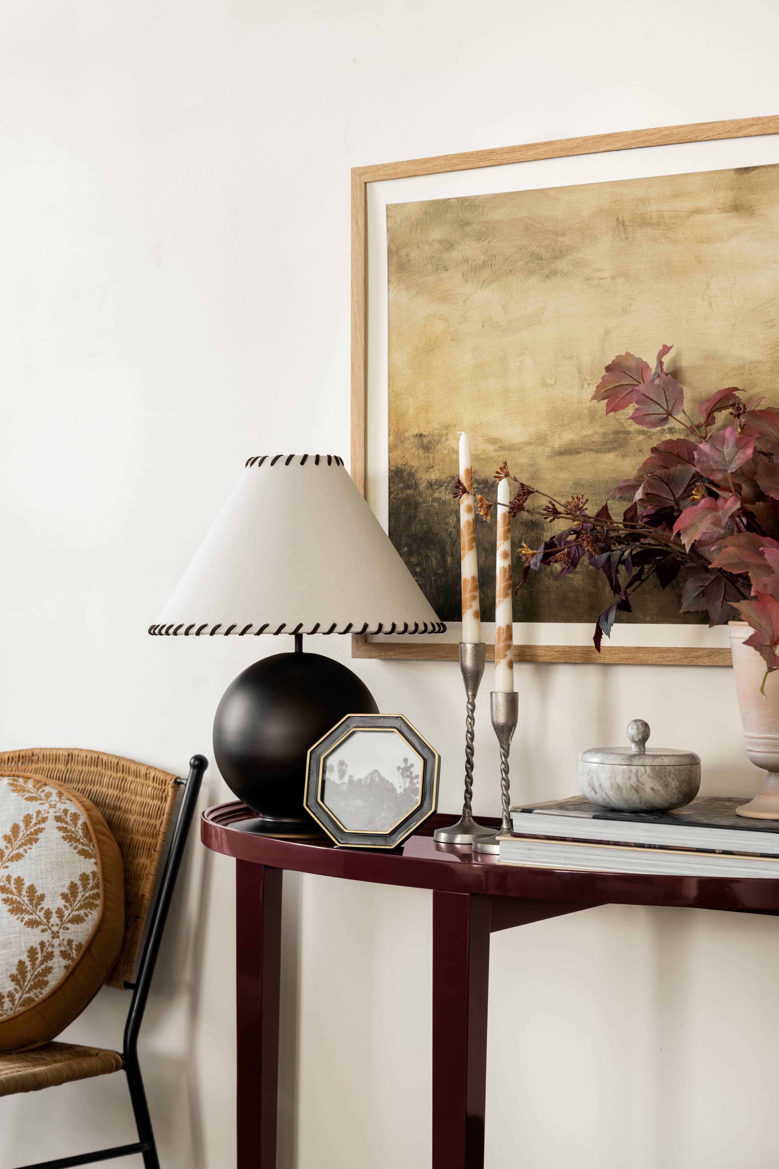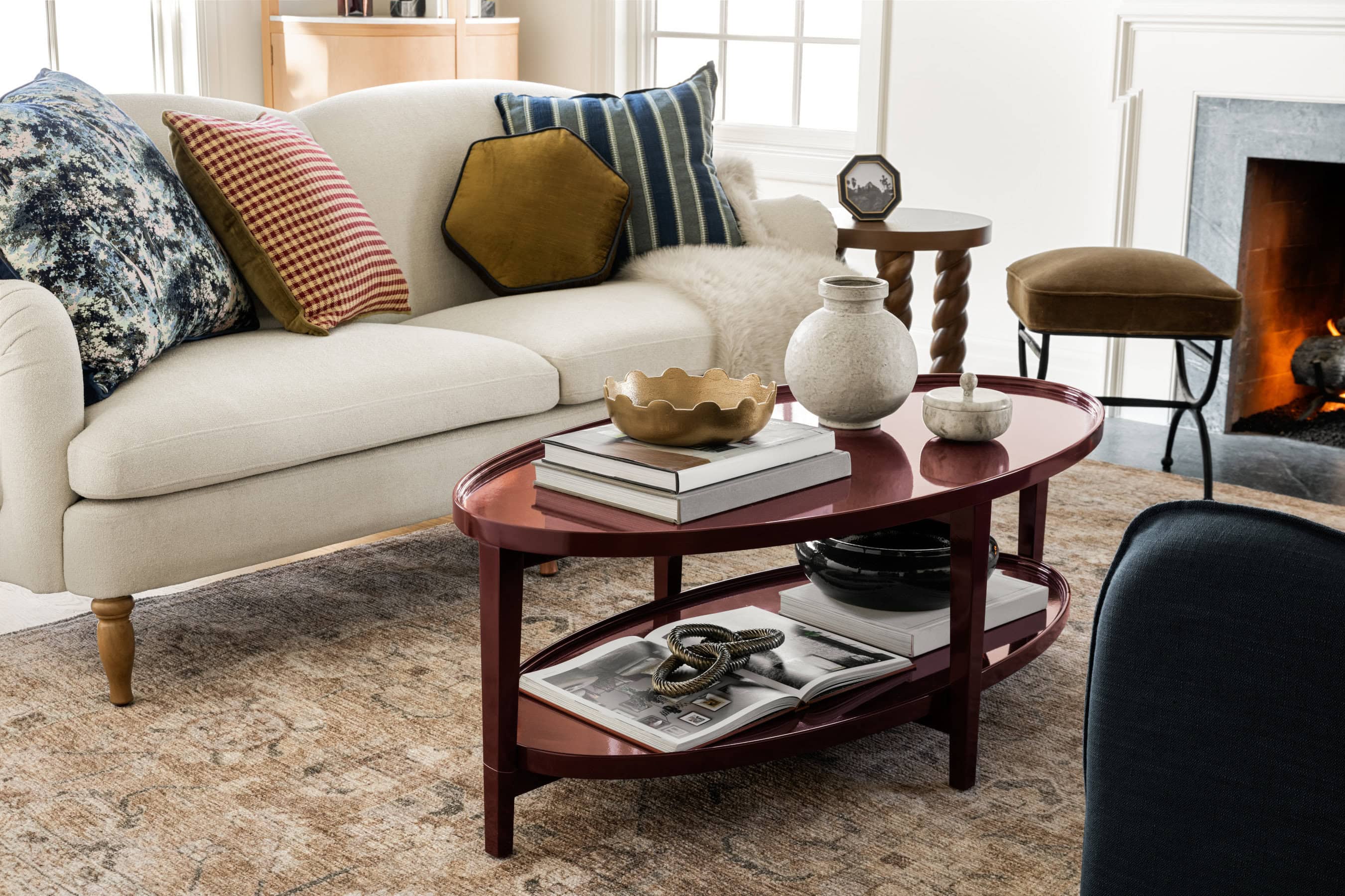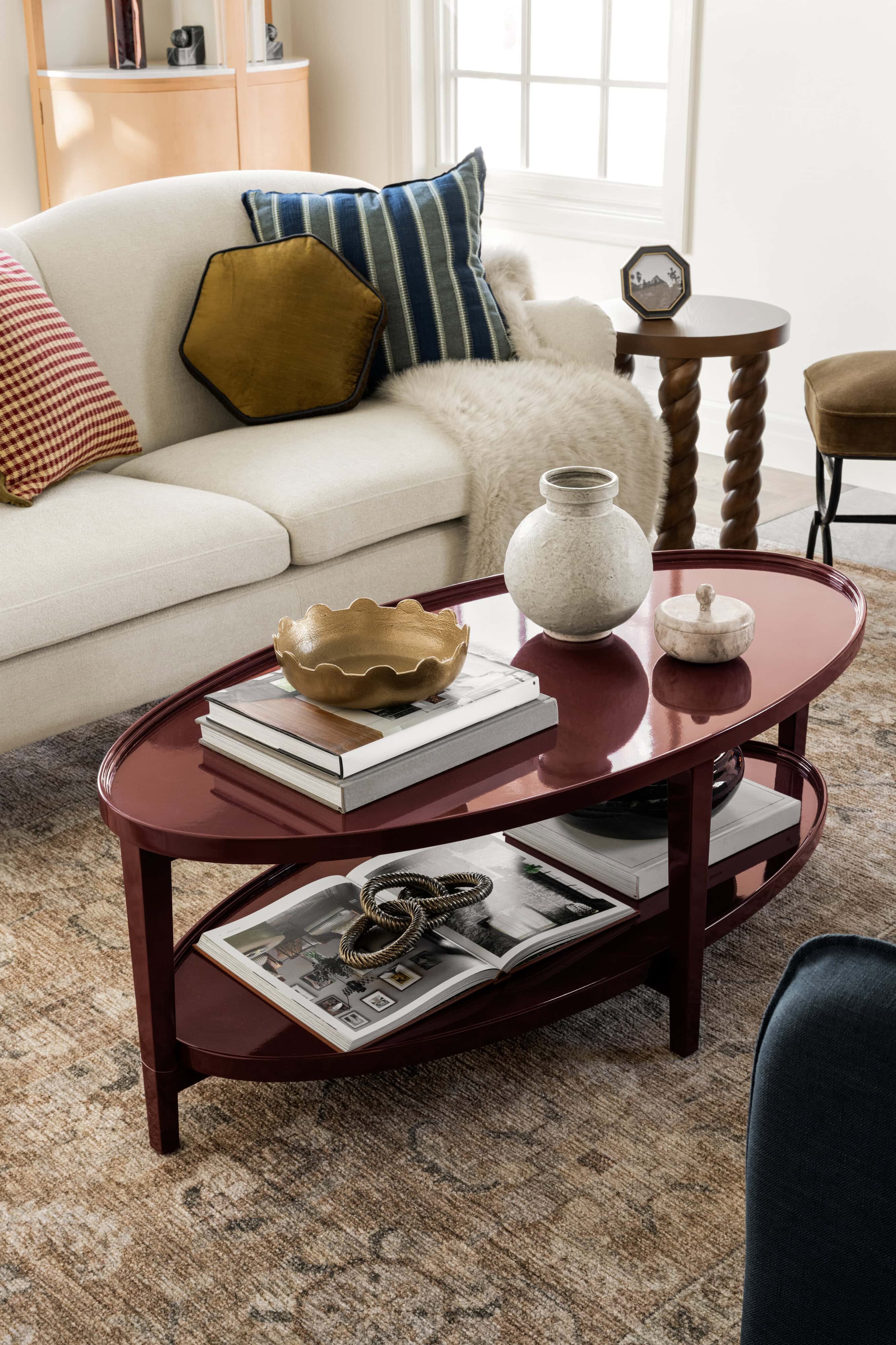 Our latest Threshold x Studio McGee collection at Target features several standout pieces that nod to the lacquered look. Each piece is finished in a deep oxblood hue that feels more like a refined statement than a trend-driven accent. The coffee table grounds a living room with its sculptural oval shape. The console table adds drama and polish to an entryway or behind a sofa. And the side table is a versatile punctuation mark in any room, offering just the right hit of shine.