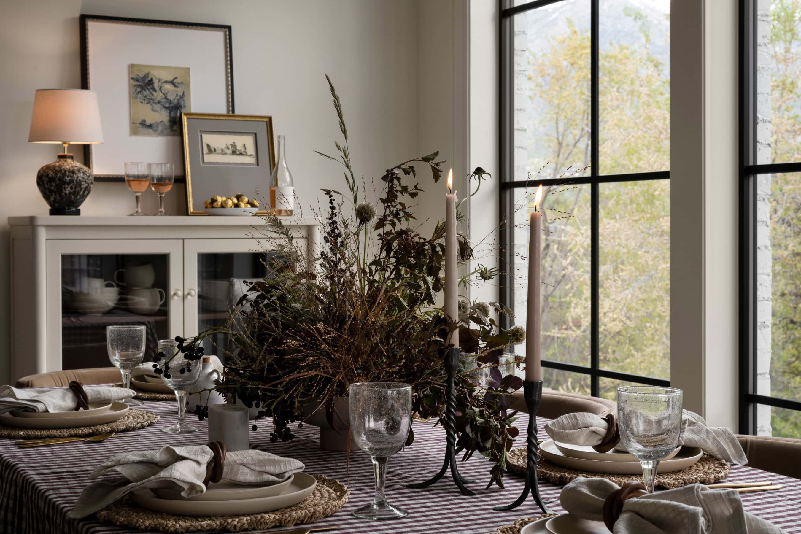 What we mean by “proof of life” is design elements that are real, organic, or alive. This can be bits of nature—dried, fresh, or faux—that you pick up at the flower market, forage yourself, or buy to ensure they can be utilized over and over again in various tablescapes to come. Florals are a classic, but they don’t need to be fussy. Use faux stems to keep it simple. Fire—being one of the five elements of nature—is also a foolproof way to make your Thanksgiving tablescape feel like it’s a living, breathing thing. Shop some of our favorite ways to incorporate proof of life below.