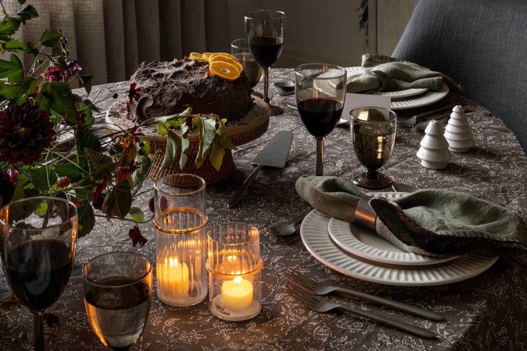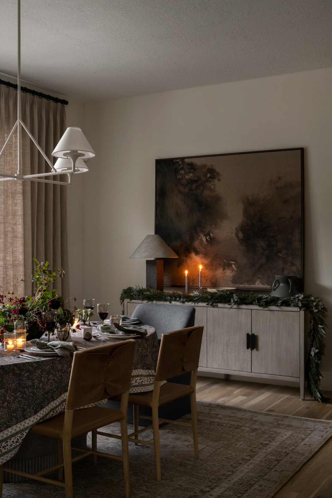 -and I love welcoming our friends and family into our home to celebrate. This year, I am looking forward to an approachable but decadent setting –think layered atmospheric lighting and a spread full of heirloom recipes. When planning the tablescape, I like to start by defining a color palette, deciding on the feeling I want to evoke, and then working out from there. The transition from fall to winter is the perfect time to incorporate a moodier scheme—I love deep reds paired with neutral tones and textures, as seen in the holiday spread below. This floral-print tablecloth and moss green linen napkins by McGee & Co. play off the colors in the dahlias and berries in this stunning centerpiece designed by Ashley Beyer of Tinge. Once I’ve established a palette, it’s easy to build from there, layering in dinnerware and glassware, then arranging décor items, like tea lights and candlesticks. The ones used in the photos below are the Adele Dinner Plate and the Pietra Wine Glasses from McGee & Co. Finish setting the mood with a festive playlist and enjoy the time with the ones you love.