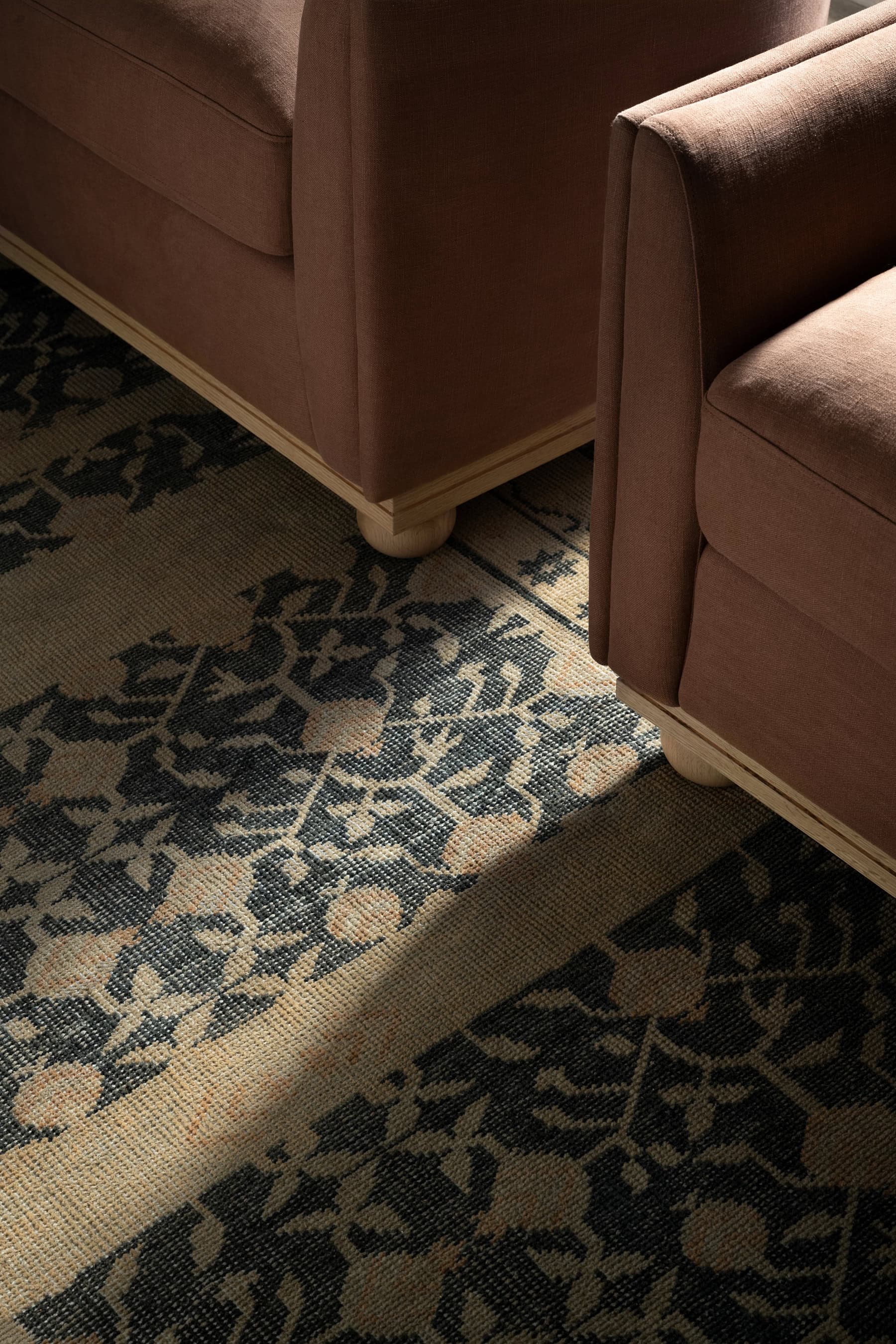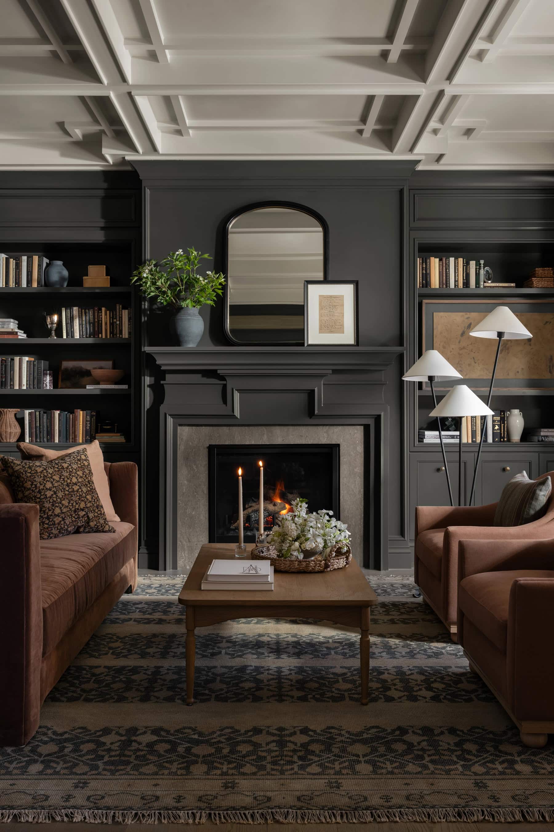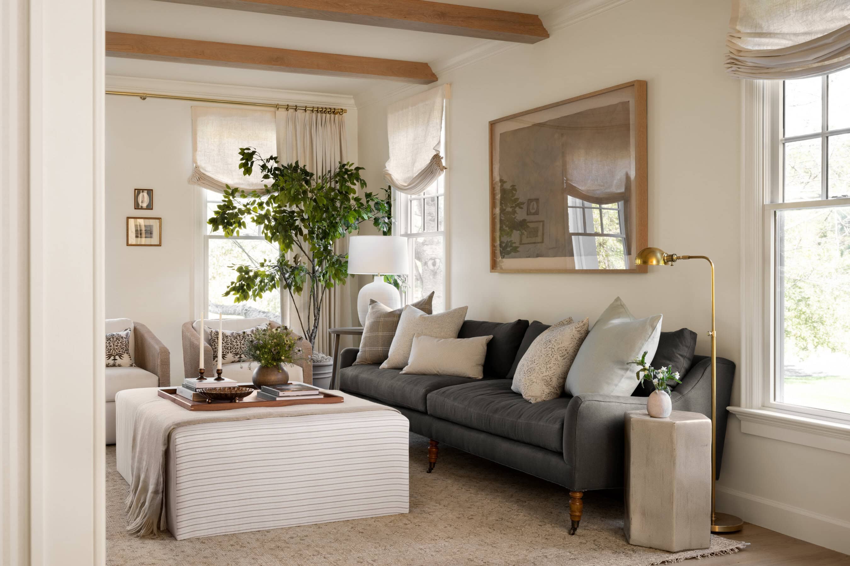 A rug does more than add color—it grounds the entire room. When a rug is too small, it can throw off the proportions of the space and make it feel cramped. We like to ensure that at least the front two legs of your larger furniture pieces are on the rug. While it’s more traditional to place all four legs on the rug (something we rarely do), we never leave the rug floating in the middle of the room. And when it comes to end tables, keep them either fully on or off the rug—no one wants a wobbly table! Need more help? For more information on rug sizing, check out this in-depth guide on choosing the right rug size.