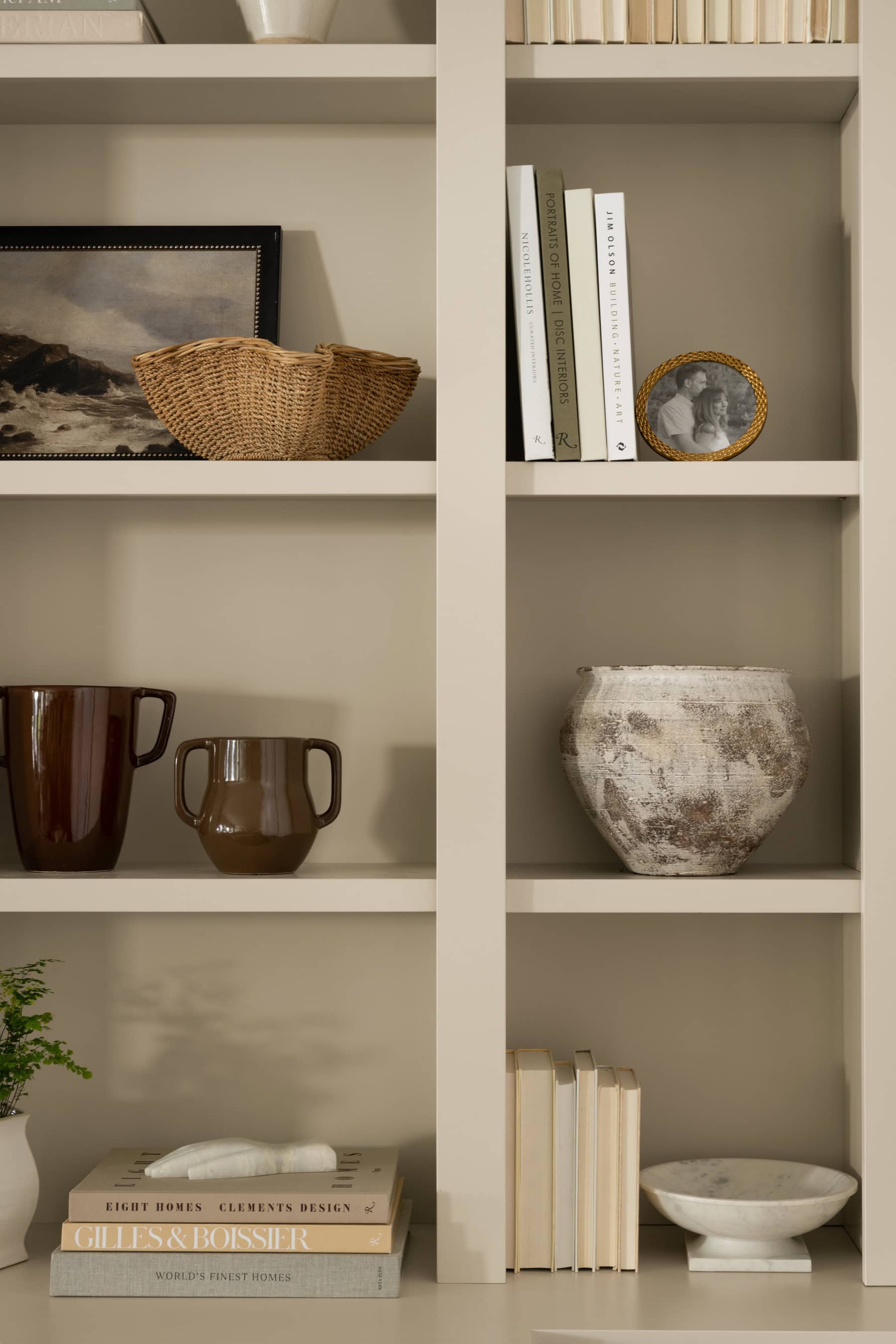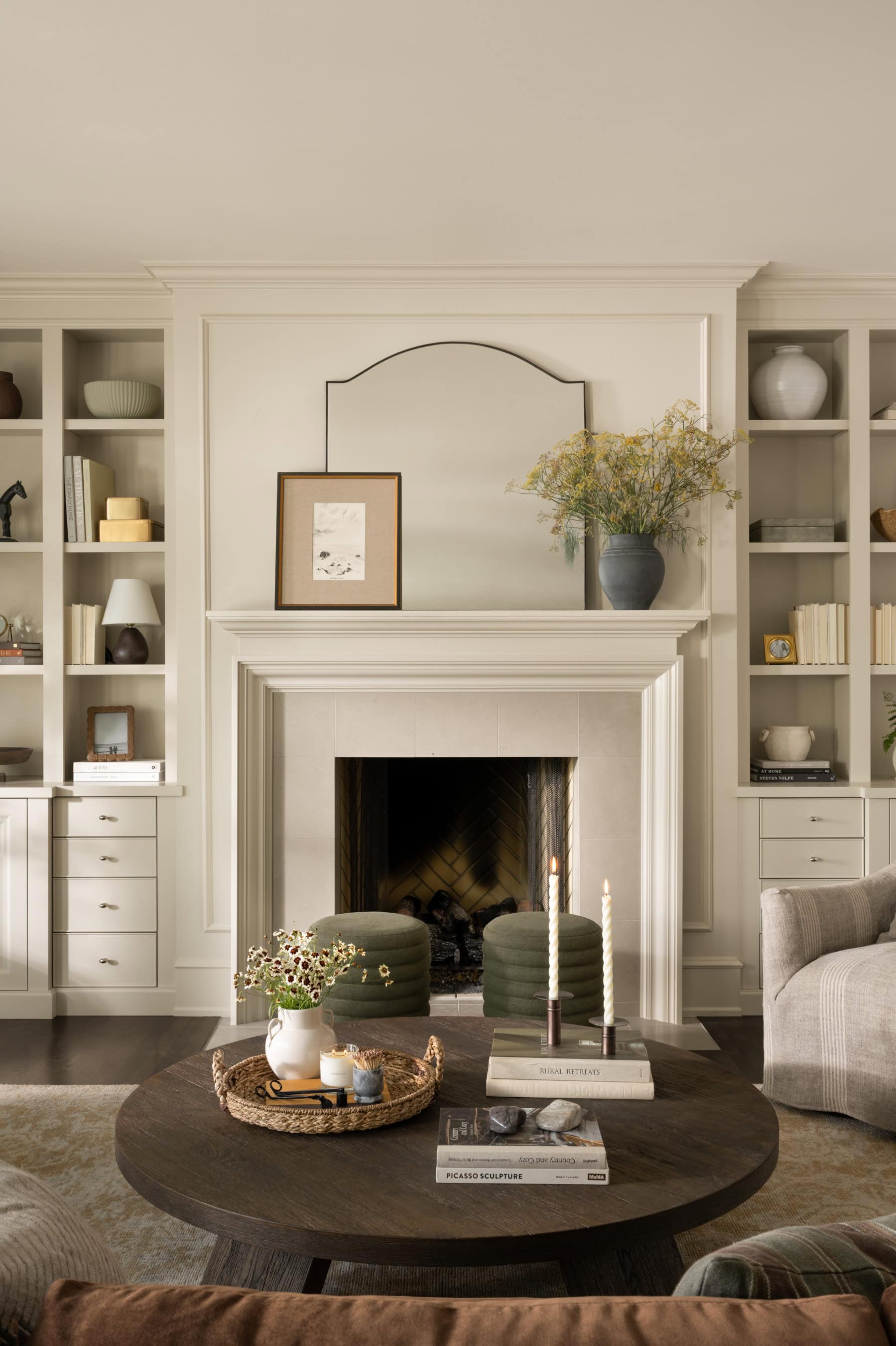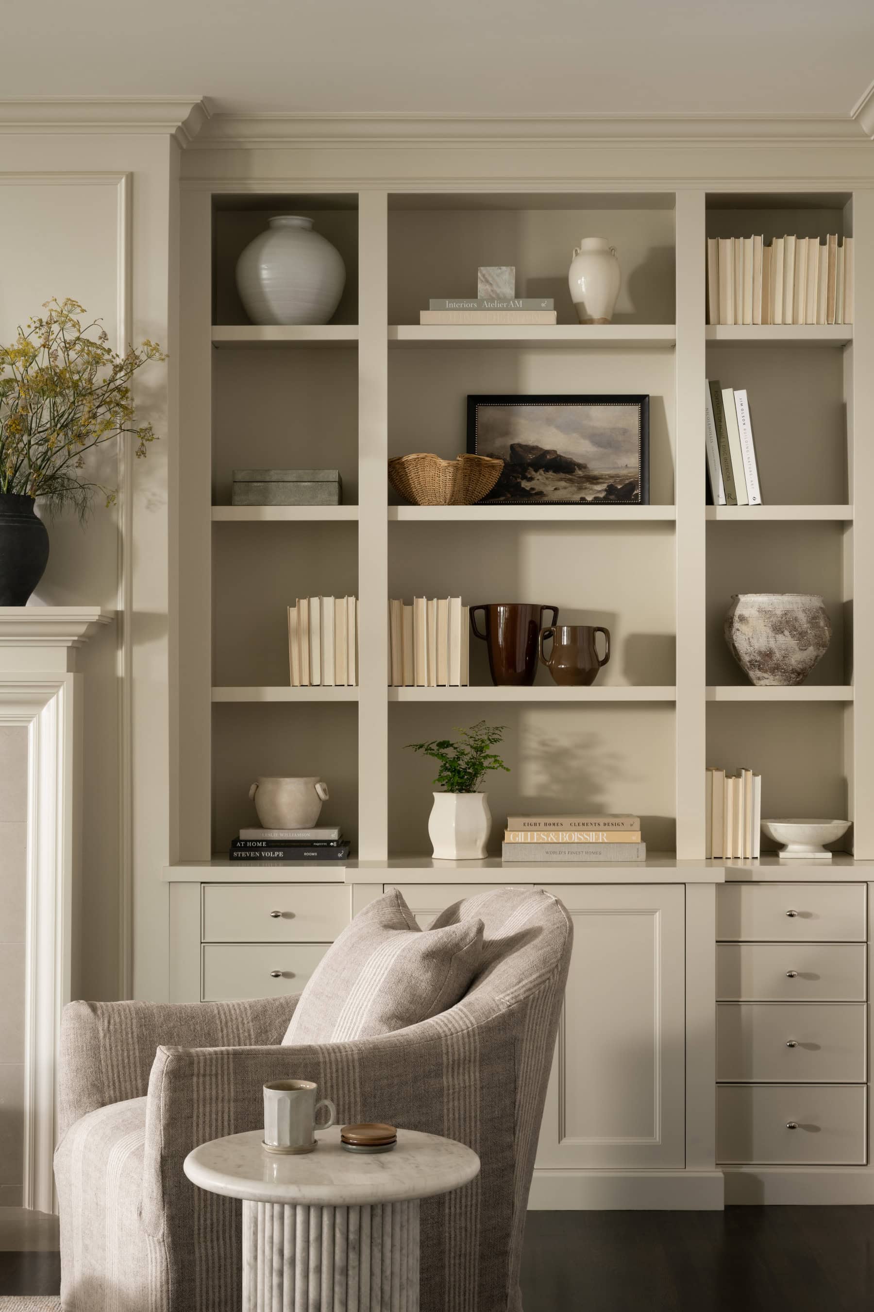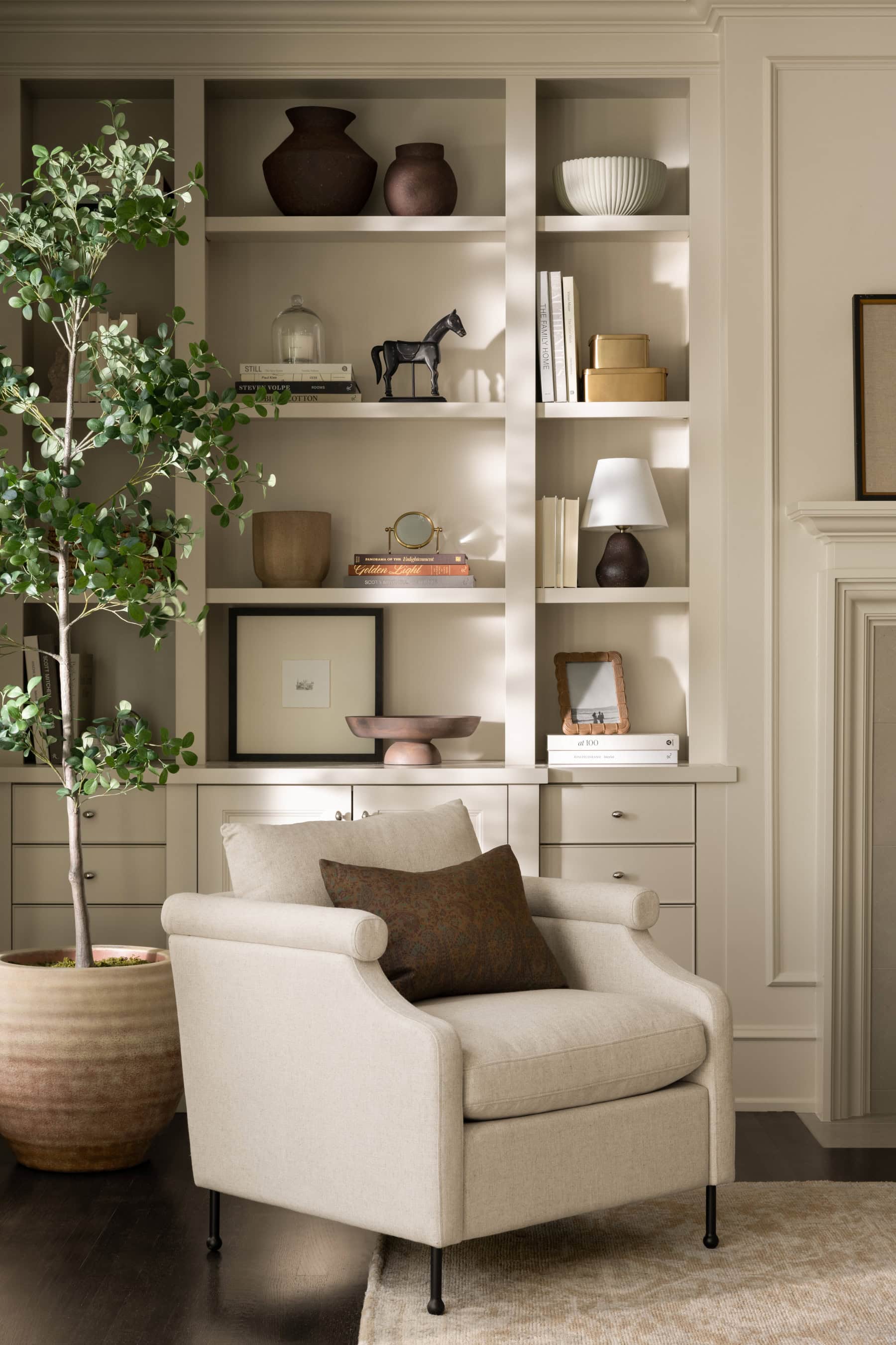 Over-styling is another common pitfall of living room styling. Filling every inch of a shelf, tabletop, or built-in with decor can create a cluttered look. Instead, give your accessories space to breathe. When there’s no visual rest, the decor feels chaotic and overwhelming. You don’t have to style every single spot. Instead, create intentional groupings by mixing small objects with larger ones. Use trays, bowls, or boxes to corral smaller items and keep things tidy.