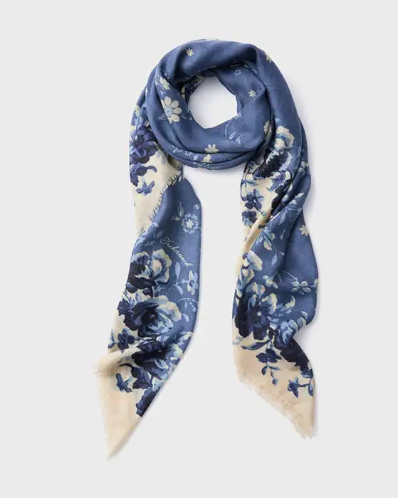Slate Blue Fading Floral Silk Cashmere Blend Large Scarf